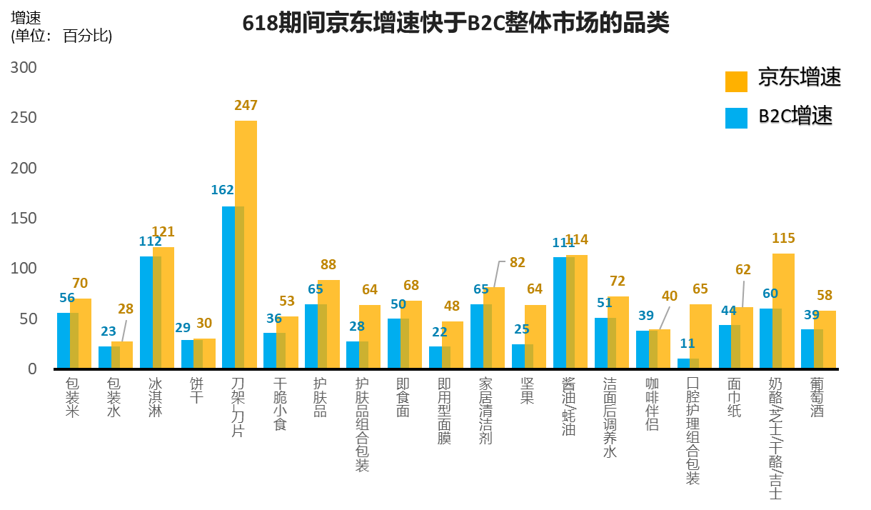 尼爾森618期間監(jiān)測的快消品類數(shù)據(jù)發(fā)現(xiàn),京東增速超過市場整體增速,從細(xì)分品類分析,618期間以食品為代表的大量民生品類在京東增速明顯超越大盤,充分展示了消費者對于京東平臺的信賴。京東大數(shù)據(jù)則顯示在2020年上半年已經(jīng)有超過10000個品牌在京東超市實現(xiàn)成交額同比增長100%,7000個品牌實現(xiàn)成交額同比增長200%,5000個品牌實現(xiàn)成交額同比增長300%,有200個品牌實現(xiàn)成交額超億元,超20個品牌實現(xiàn)成交額超10億。