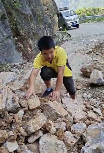 由于前期暴雨天氣,焦厚松車才開到半路,就看到前方的路有了滑坡,緊靠著崖壁的道路已經(jīng)垮了一半。“掉頭還是前行?”焦厚松最終戰(zhàn)勝了猶豫,“答應了用戶今天送到,不能就這樣放棄,先看看情況?!彼_始下車觀察路況,發(fā)現(xiàn)主要是碎石堵住了前方七八米的路程?!叭绻謇硪恍?,車輛就能開過去?!闭f干就干,焦師傅隨后就開始徒手清理路上的石塊。