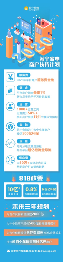 蘇寧宣布,2020年蘇寧將免收平臺商戶服務(wù)費;平臺上的商品供應鏈會向蘇寧生態(tài)中10萬+實體小店開放,幫助商戶擴大銷售通路。同時,大家電行業(yè)線將持續(xù)給平臺商戶匹配站內(nèi)外的億級流量,并通過星河生態(tài)賦能平臺開放1000+運營工具,針對核心商戶提供1對1專屬運營指導,借此幫助商戶有效提升經(jīng)營效率,降低運營成本。818期間,平臺訂單傭金從最低1%降至0.8%,針對核心單品提供雙百億補貼,且向平臺商戶給予10億+的流量導流扶持,幫助商戶全面應戰(zhàn)818。