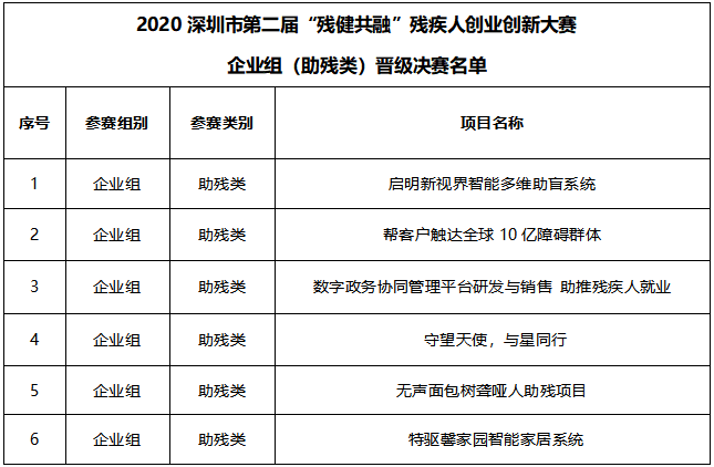 2020深圳市第二屆“殘健共融”殘疾人創(chuàng)業(yè)創(chuàng)新大賽團(tuán)隊(duì)組(助殘類)晉級決賽名單