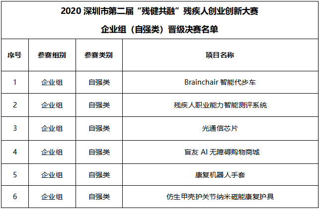 2020深圳市第二屆“殘健共融”殘疾人創(chuàng)業(yè)創(chuàng)新大賽企業(yè)組(自強(qiáng)類)晉級決賽名單