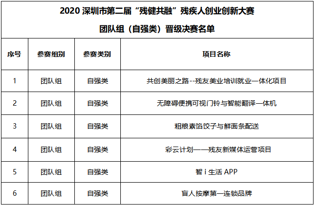 2020深圳市第二屆“殘健共融”殘疾人創(chuàng)業(yè)創(chuàng)新大賽團(tuán)隊(duì)組(自強(qiáng)類)晉級決賽名單