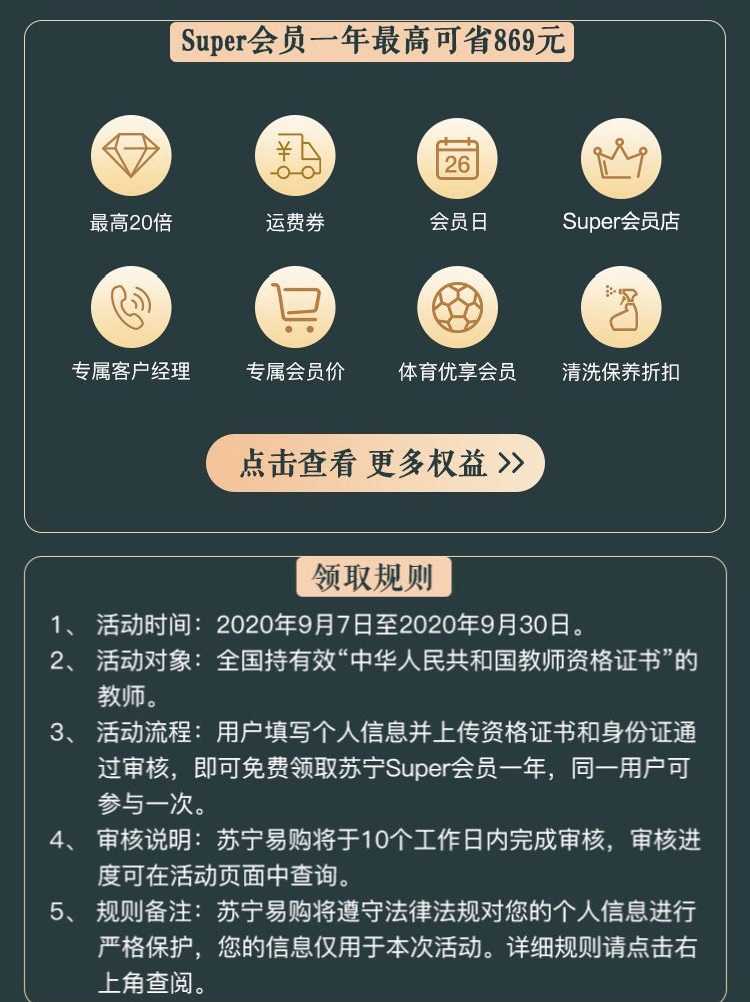 9月7至9月30日,凡持有效“中華人民共和國教師資格證書”的老師,在蘇寧易購AP P上搜索“教師”,進(jìn)入 Super會員領(lǐng)取頁面,填寫個人信息并上傳資格證書和身份證。通過審核后,即可免費(fèi)領(lǐng)取蘇寧Super會員年卡一張。
