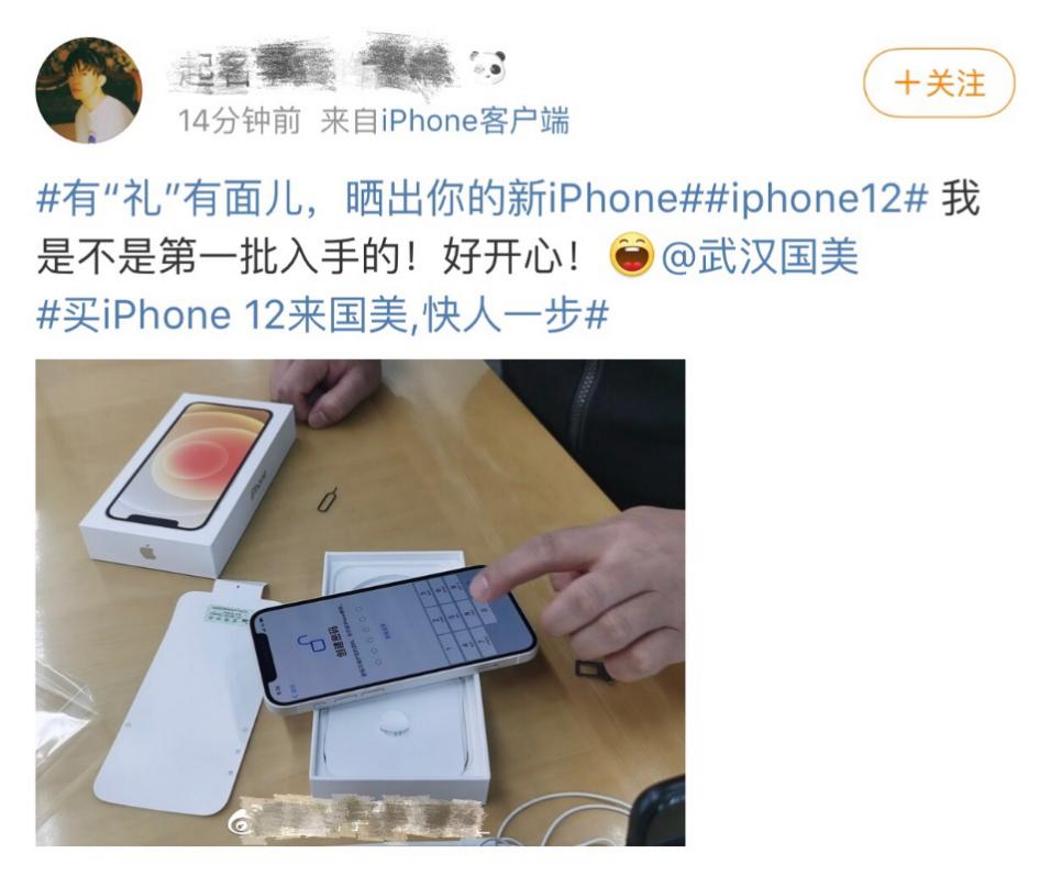 還有“果粉”在收到國美閃電配送的iPhone12后,第一時間就微博曬新機:“我是不是第一批入手的!好開心!”還配上了一個張iPhone12拍出的新鮮出爐的大片。馬上就有跟帖說:“你就是微博今日最佳最靚的仔!”。