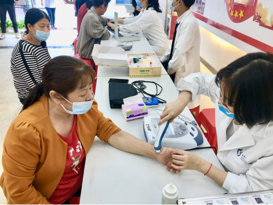 活動(dòng)現(xiàn)場(chǎng),社區(qū)居民聞?dòng)嵍粒蜥t(yī)務(wù)工作人員咨詢各種保健知識(shí)和健康問(wèn)題,通過(guò)測(cè)量血壓、中醫(yī)學(xué)全息四診(望、聞、問(wèn)、切)等形式。