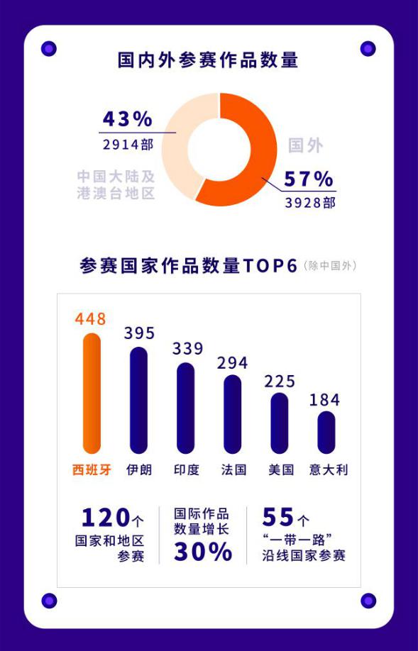 自今年9月中旬全球短片征集啟動(dòng)以來,本屆短片節(jié)獲得來自世界各地創(chuàng)作者的積極響應(yīng),盡管受到新冠疫情影響以及遭遇影視產(chǎn)業(yè)寒冬,但本屆短片節(jié)參賽作品數(shù)量卻逆勢(shì)而上,并刷新歷史新高。而且,在今年的6842部參賽作品中,國際參賽作品多達(dá)3928部,數(shù)量較去年增長(zhǎng)30%,占作品總量的57%。在今年參賽的120個(gè)國家和地區(qū)中,作品數(shù)量位居前六名的國家分別是西班牙(448部)、伊朗(395部)、印度(339部)、法國(294部)、美國(225部)和意大利(184部)。值得一提的是,作為深圳市參與“一帶一路”建設(shè)重點(diǎn)項(xiàng)目,短片節(jié)今年吸引了來自“一帶一路”沿線的55個(gè)國家參賽,約占目前65個(gè)“一帶一路”沿線國家數(shù)的85%,短片節(jié)作為推動(dòng)“一帶一路”沿線國家間人文交流、促進(jìn)全球跨文化傳播的重要平臺(tái)的作用日益凸顯,國際化進(jìn)一步走向深入。