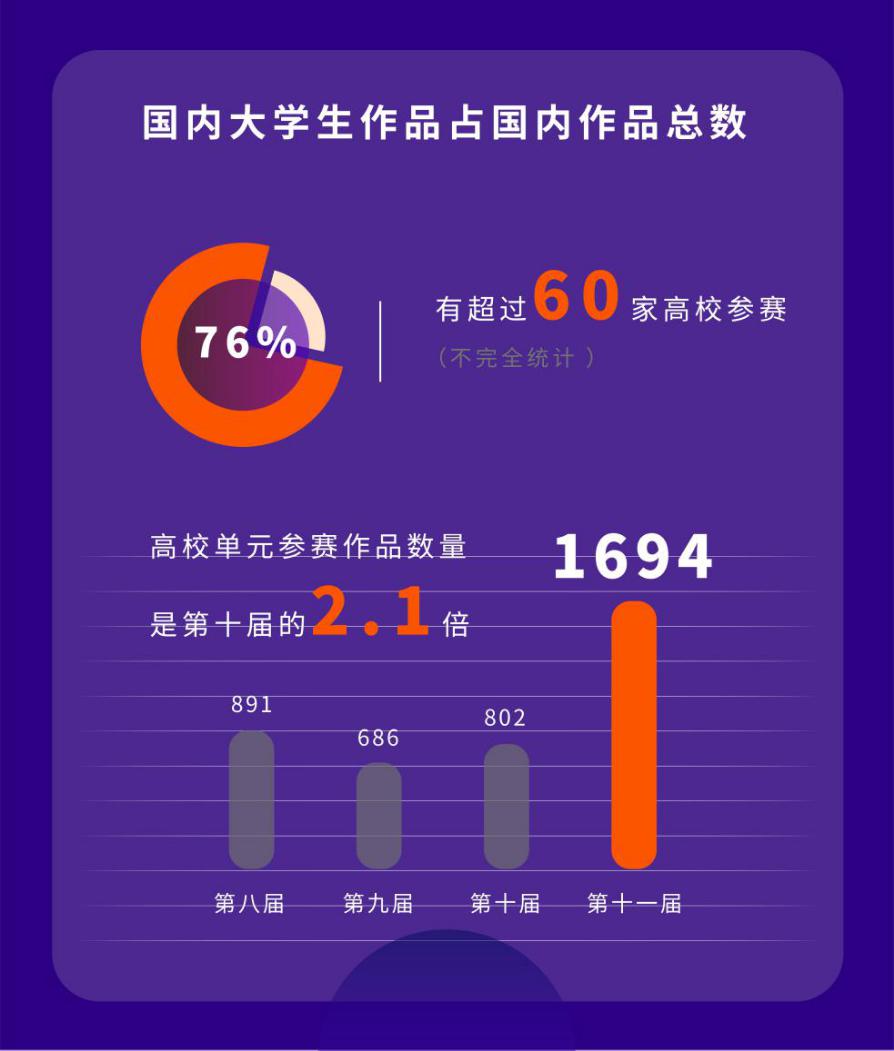 作為參與金鵬短片導(dǎo)演扶持計(jì)劃的重要力量,今年高校大學(xué)生的參賽積極性持續(xù)高漲。本屆短片節(jié)發(fā)起的“全國大學(xué)生視頻創(chuàng)意大賽”共收到來自全國超過60所高校的1694部參賽作品,數(shù)量同比增長(zhǎng)一倍。國內(nèi)大學(xué)生參賽作品數(shù)量在所有國內(nèi)參賽作品總數(shù)中占比58%,大學(xué)生創(chuàng)作者一躍成為金鵬短片導(dǎo)演扶持計(jì)劃的中堅(jiān)力量,凸顯了新時(shí)代下年輕創(chuàng)作者對(duì)短片以及短視頻的無限熱情和興趣執(zhí)著。大學(xué)生競(jìng)賽單元將分別評(píng)選出“最佳大學(xué)生短片”、“最佳大學(xué)生劇情短片”、“最佳大學(xué)生紀(jì)錄短片”、“最佳大學(xué)生動(dòng)畫短片”、“最佳大學(xué)生VLOG短片”、“最佳大學(xué)生科普短片”、“最佳大學(xué)生廣告創(chuàng)意短片”、“最佳大學(xué)生原創(chuàng)音樂短片”等9大類型入圍優(yōu)秀作品。
