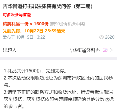 為激發(fā)轄區(qū)居民參與打擊非法集資的熱情,吉華街道經(jīng)科辦組織開展了打擊非法集資知識(shí)有獎(jiǎng)問(wèn)答活動(dòng)和轉(zhuǎn)發(fā)打擊非法集資宣傳推文朋友圈打卡活動(dòng),寓教于樂(lè),切實(shí)普及打擊非法集資相關(guān)知識(shí),提高居民自我保護(hù)能力,引導(dǎo)轄區(qū)居民參與到防范和打擊非法集資活動(dòng)中來(lái),做到轄區(qū)人人不參與、能識(shí)別、敢揭發(fā)、會(huì)舉報(bào)非法集資,共同維護(hù)轄區(qū)的和諧穩(wěn)定。活動(dòng)開展以來(lái),轄區(qū)居民積極踴躍參與,共計(jì)3000余民轄區(qū)居民參與其中,派發(fā)禮品2000份。