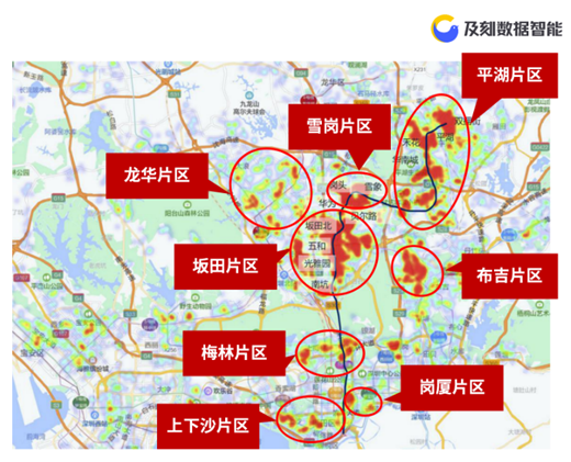 從熱力圖中可以看出,10號線客流集中居住在三大片區(qū):平湖、雪崗、坂田,深圳地鐵10號線的開通,結(jié)束了三大片區(qū)內(nèi)多數(shù)區(qū)域不通地鐵的歷史,這三個(gè)大片區(qū)的居民成為了10號線的主力乘客。
