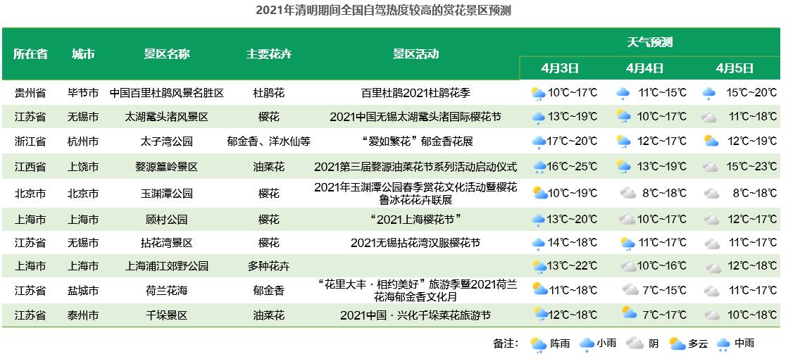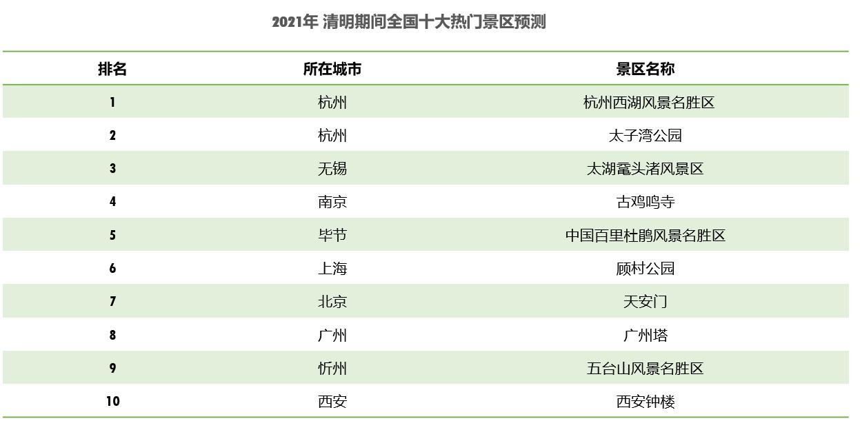 預(yù)計清明假期杭州西湖風景名勝區(qū)最為熱門,其次為太子灣公園、太湖黿頭渚風景區(qū)、古雞鳴寺、中國百里杜鵑風景名勝區(qū)、顧村公園、天安門、廣州塔、五臺山風景名勝區(qū)、西安鐘樓。