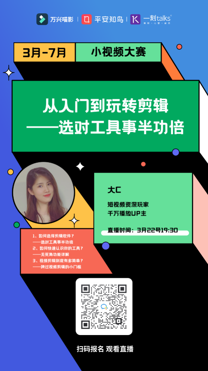 據(jù)悉,#一分鐘SHOW職場(chǎng)干貨#小視頻大賽自3月求職季上線,將持續(xù)至7月底,為期4個(gè)月,大賽包含作品提交至平安知鳥APP、12場(chǎng)線上直播、線上初賽、晉級(jí)復(fù)賽、線下決賽及頒獎(jiǎng)典禮等環(huán)節(jié)。根據(jù)規(guī)劃,大賽設(shè)有專家評(píng)審委員會(huì)、培訓(xùn)專家團(tuán),并設(shè)置數(shù)十萬(wàn)獎(jiǎng)金池,獲獎(jiǎng)?wù)卟粌H將有機(jī)會(huì)瓜分獎(jiǎng)金大獎(jiǎng),更有機(jī)會(huì)成為職場(chǎng)知識(shí)網(wǎng)紅“C位”出道。萬(wàn)興喵影作為活動(dòng)主辦方之一,在此次大賽中將提供視頻創(chuàng)意軟件工具、活動(dòng)專用視頻資源包、千萬(wàn)播放UP主視頻制作講解直播課等資源,全方位賦能選手輸出高品質(zhì)內(nèi)容。