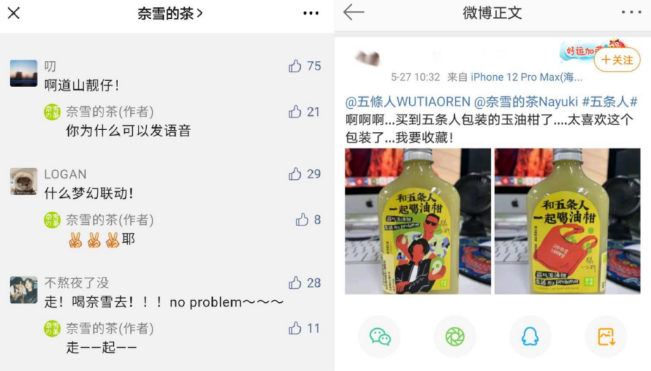 這樣“肆意妄為”的話從五條人嘴里蹦出并不稀奇,他們與生俱來的“平凡生活浪漫主義”,擅長洞察事物的另一面。精妙的是,奈雪的茶洞察到用戶在日常生活中的種種焦慮,將霸氣玉油柑“先澀后甜”的特點比作人生滋味,用這一豁達積極的態(tài)度來輕松正能量地引導(dǎo),這一點與五條人的精神內(nèi)核如出一轍。5月27日奈雪的茶X五條人TVC發(fā)布后,不少網(wǎng)友表示這波是“破次元壁”的夢幻聯(lián)動,還有網(wǎng)友在線分享五條人歌曲中有共鳴的歌詞。