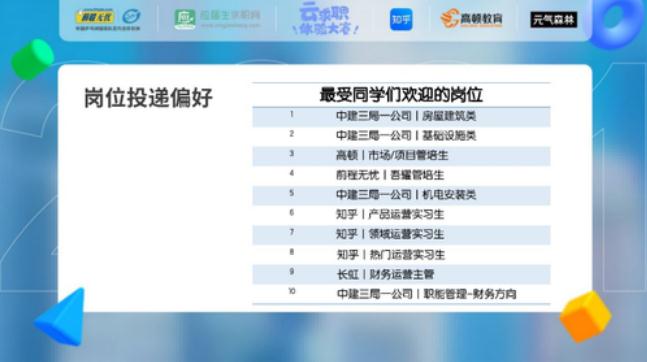 這一點(diǎn)在本次大賽中,也得到了很好的證明,10家企業(yè)提供的54個(gè)崗位中,投遞量最高的10個(gè)職位分別來自中建三局一公司、知乎,另外高頓及前程無憂的管培生分別排在第三、第四,不難發(fā)現(xiàn),國(guó)企、管培、互聯(lián)網(wǎng)對(duì)當(dāng)代大學(xué)生來說,更具備吸引力~