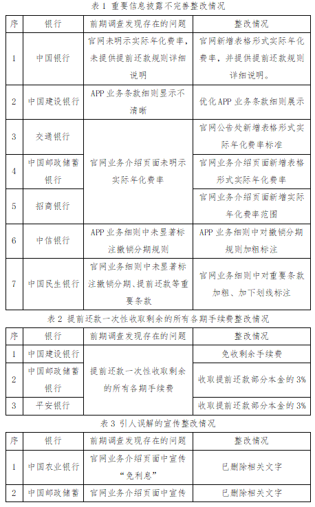 中國(guó)銀行、交通銀行、中國(guó)郵政儲(chǔ)蓄銀行、招商銀行等銀行完善了官網(wǎng)信用卡分期業(yè)務(wù)實(shí)際年化費(fèi)率的披露; 中國(guó)銀行、中國(guó)建設(shè)銀行、中信銀行、中國(guó)民生銀行等銀行完善了撤銷(xiāo)分期、提前還款規(guī)則等重要信息的披露;中國(guó)建設(shè)銀行、中國(guó)郵政儲(chǔ)蓄銀行、平安銀行針對(duì)消費(fèi)者提前還款,由原先一次性須收取剩余所有各期手續(xù)費(fèi),修改為免收剩余手續(xù)費(fèi)或僅收取一定比例違約金;中國(guó)農(nóng)業(yè)銀行、中國(guó)郵政儲(chǔ)蓄銀行、中國(guó)民生銀行刪除了“免利息”“手續(xù)費(fèi)比例不隨分期期數(shù)的增長(zhǎng)而提高”等容易引起消費(fèi)者誤解的宣傳語(yǔ)。各銀行存在問(wèn)題及整改情況如下: