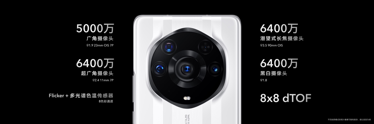 影像方面,榮耀Magic3至臻版打破手機(jī)鏡頭天花板,突破性地采用了多主攝設(shè)計。在與榮耀 Magic3 Pro采用同樣的業(yè)界領(lǐng)先6400萬潛望式長焦鏡頭和6400萬黑白鏡頭基礎(chǔ)上,榮耀 Magic3至臻版將5000萬像素超大底主攝升級為索尼 IMX700,傳感器尺寸達(dá)到1/1.28英寸,擁有業(yè)界領(lǐng)先的感光度(ISO),成像解析力、暗光拍攝能力更強(qiáng)。而超廣角微距鏡頭,也從1300萬像素,升級為業(yè)界領(lǐng)先的6400萬像素126°超大廣角微距鏡頭,能完美呈現(xiàn)廣闊空間中整個建筑、地標(biāo),亦能捕捉2.5cm近距離下的微小細(xì)節(jié),提供肉眼無法看到的創(chuàng)意視角。多主攝計算攝影,實(shí)現(xiàn)多焦段高清影像。