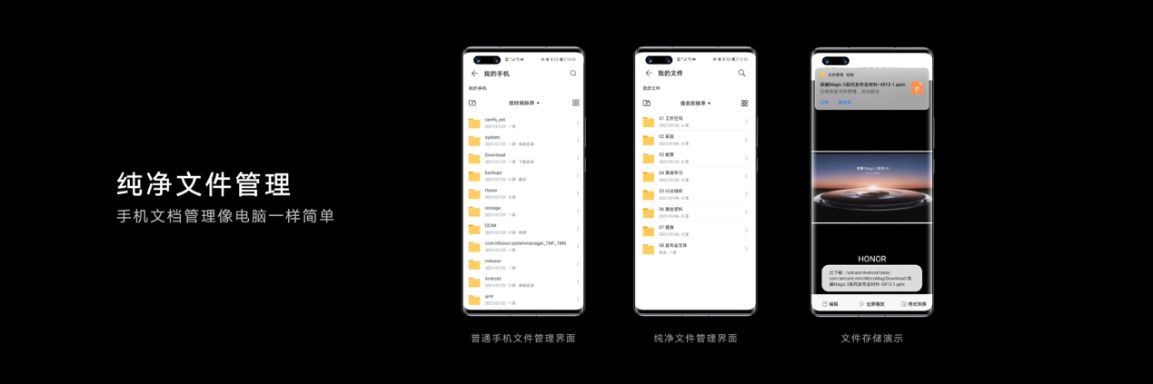 為了幫助事務(wù)繁多的商務(wù)人士更高效管理個人事務(wù),榮耀還與各辦公平臺合作,讓用戶在釘釘、飛書、Welink、WPS辦公平臺的日程均能通過榮耀Magic3系列進(jìn)行統(tǒng)一管理。而新增的純凈文件管理系統(tǒng)(此功能后續(xù)通過 OTA升級支持),則使榮耀Magic3系列在文件保存和管理方面進(jìn)行進(jìn)一步簡化,讓手機(jī)文件管理從此可以像電腦一樣簡單便捷。