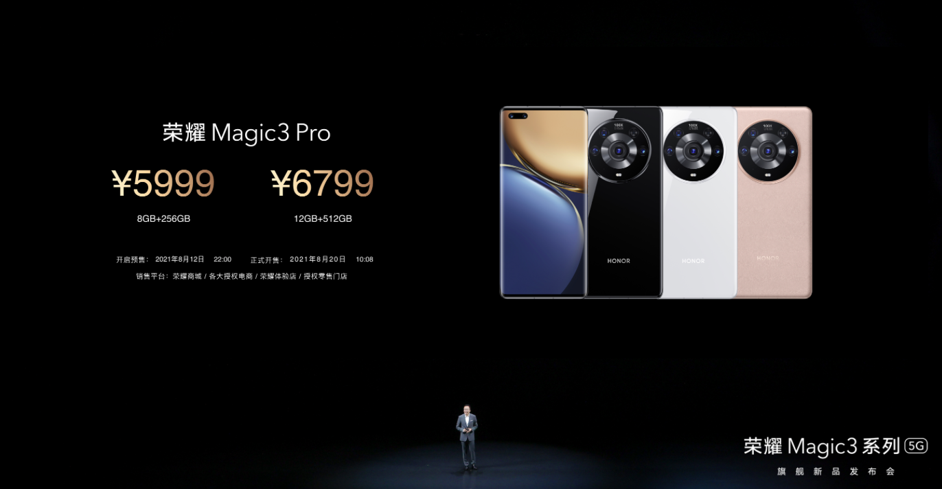 榮耀 M agic38GB+128GB版售價4599元,8GB+256GB版售價4999元;榮耀Magic3 Pro8GB+256GB版售價5999元,12GB+512GB版售價6799元;榮耀Magic3至臻版12GB+512GB售價7999元。8月12日22:00榮耀 Magic3系列手機(jī)正式開啟預(yù)售,8月20日10點(diǎn)08分,榮耀 M agic3系列手機(jī)將于榮耀商城、各大授權(quán)電商、榮耀體驗(yàn)店、榮耀零售門店等全平臺開售。