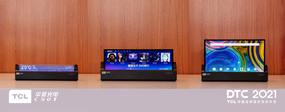 14"噴墨打印OLED卷軸屏,可以自由變換多種形態(tài),數(shù)字顯示鬧鐘、音樂播放器、顯示器,多種應(yīng)用形態(tài)無縫切換,完美融入家居場景中,盡顯柔性O(shè)LED顯示的魅力。它的卷曲半徑<R20mm,在高溫高濕條件下,卷曲壽命高達10萬次,再配合自發(fā)光高精度噴墨印刷工藝制備技術(shù),以及內(nèi)置的AI補償算法,可以使它的畫面色彩更加明艷通透,顯示效果也得到了大幅提升。該產(chǎn)品目前由TCL華星跟日本JOLED合作推出。