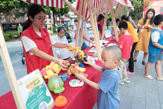 活動(dòng)現(xiàn)場(chǎng)設(shè)有“換享游戲區(qū)”“換享市集區(qū)”“換享留影區(qū)”“換享觀影區(qū)”四大區(qū)域,吸引了200余名社區(qū)居民、志愿者、小朋友共同參與,發(fā)放《條例》手冊(cè)和宣傳資料250余份。