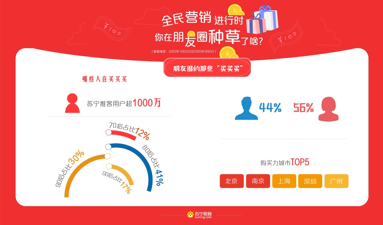 近日,蘇寧易購(gòu)發(fā)布全民營(yíng)銷(xiāo)大數(shù)據(jù),2020年1月25日至3月5日,蘇寧推客買(mǎi)家數(shù)和賣(mài)家數(shù)分別突破千萬(wàn)、百萬(wàn)大關(guān),80后成為朋友圈買(mǎi)、賣(mài)“雙主力”,糧油休食、個(gè)護(hù)家清、生鮮等產(chǎn)品成為最受歡迎的消費(fèi)品類(lèi)。