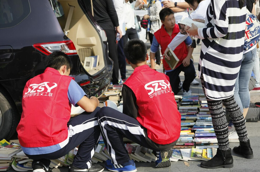 深圳市實驗中學(xué)的車尾箱展位前圍滿了前來換書的人
