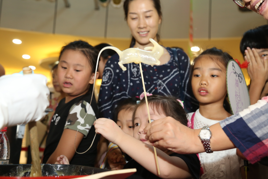 現(xiàn)場,糖人制作師傅安靜地坐在展臺前,任人群在身邊走走停停,埋頭專注捏著各式形狀。只見他用竹篾緩緩攪拌麥芽糖,挖出一團放在手里揉捏拉扯,做出一個小管子,抿嘴往里吹氣,麥芽糖慢慢膨脹并逐漸變成透明,再迅速捏出頭和腳,一只糖老鼠便活靈活現(xiàn)地被“吹”了出來。“太神奇了,麥芽糖在叔叔手中變成了‘活’的,沒想到傳統(tǒng)手工藝如此出神入化?!?0歲的玥玥瞧得津津有味,她說,比起逛商場和游樂場,這樣的體驗活動不僅能感受到中華傳統(tǒng)文化,還可以學(xué)到很多課本以外的知識。