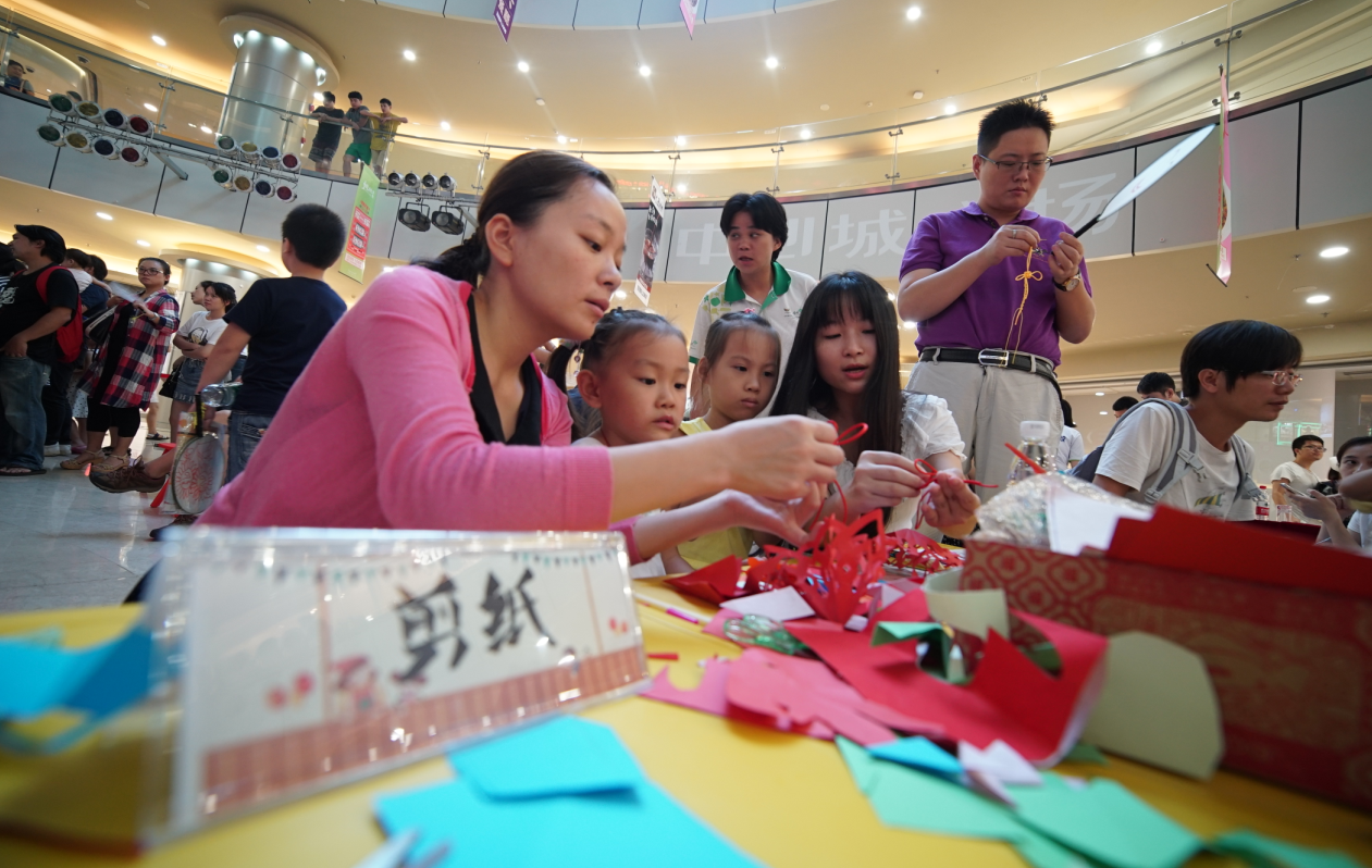此外,中國結(jié)、素面扇繪畫、剪紙等體驗區(qū)域,也擠滿了小朋友。家長們用手機記錄下孩子體驗制作的過程,對老師們的現(xiàn)場演示贊不絕口。