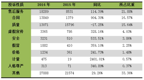 2016年投訴分類統(tǒng)計