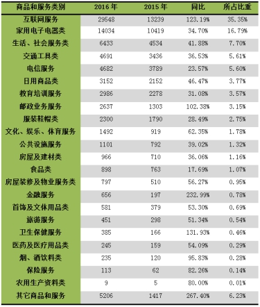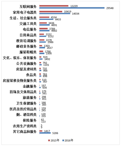2016年商品和服務(wù)二十三大類投訴,相對2015年數(shù)量均有所增長?;ヂ?lián)網(wǎng)服務(wù)、家用電子電器類、生活社會服務(wù)類、交通工具、電信服務(wù)類五大類投訴量居前,分別占投訴總量的35.35%、16.79%、7.70%、5.61%和5.60%。