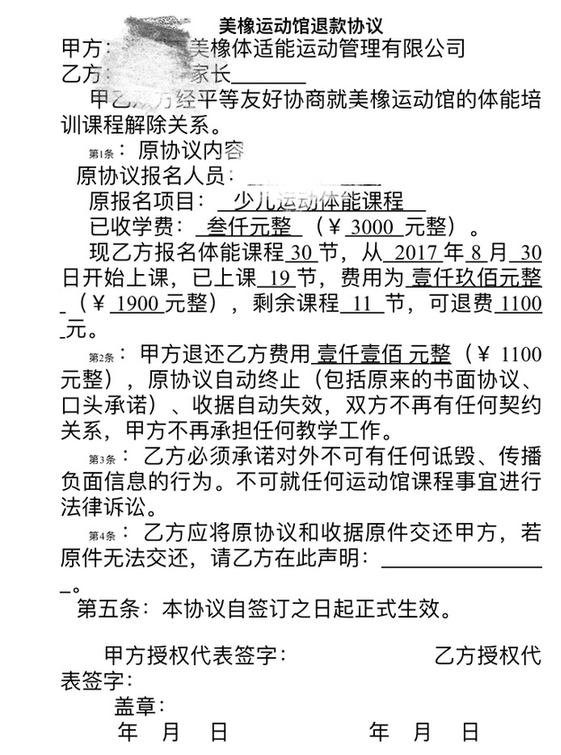 我于2017年8月30日續(xù)報深圳市美橡體適能運動管理有限公司體能課程,已經(jīng)是第三次報了,每次3000元,30節(jié)課,都是與教練微信溝通與轉(zhuǎn)帳。2018年1月10日收到該公司通知說結束體能館的業(yè)務,不再營業(yè),說統(tǒng)一給我們退剩余的課程費用,12號加了該公司財務微信溝通相關退費事宜,財務說統(tǒng)計好在一周內(nèi)統(tǒng)一給我們退費,19號收到財務信息,說可以退回1100元,還說幾天后可以退款,并說好通過微信退還(當時壓根沒有說簽協(xié)議后再退),一周拖一周,在23號忽然發(fā)微信來通知說要求去簽協(xié)議才退款,當天又進行了協(xié)商,因為我?guī)z小孩實在抽不出時間去他們公司,能否把協(xié)議發(fā)到我郵箱確認,財務說先與他老板匯報后第二天給回復,但第二天也沒有收到任何回復,然后又問財務協(xié)議發(fā)過來了嗎?財務二話沒說就把協(xié)議通過微信發(fā)給我,當時想想簽了就算了,但細看第三、四條真的很難讓人接受,內(nèi)容詳見附件1。我們交費的時候什么協(xié)議、收據(jù)對方都沒給,現(xiàn)在退錢就要求我們簽協(xié)議,而且是霸王條款,還叫我寫上“我自愿終止培訓課程”,老天哪是我自愿的,真是有種迫良為猖的感覺,還有第三條,也太污辱人格了,再次和他們友好協(xié)商希望把協(xié)議第三條改了,對方視而不見,不理不睬,也不積極回應。