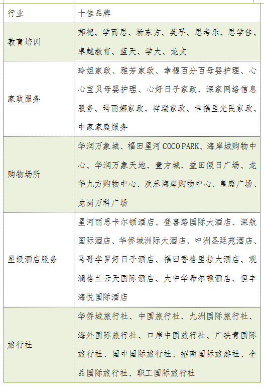 教育培訓方面20個課外培訓機構(gòu)品牌的凈推薦值得分均為正值,整體平均得分為13.7,邦德教育以19.9的高分榮登教育培訓行業(yè)榜單首位;家政服務(wù)行業(yè)20家調(diào)查企業(yè)平均分值為12.8,玲姐家政以高于平均值7.4分,排名家政行業(yè)第一位;購物場所方面選取20家購物中心,20家購物中心得分同樣為正值,整體平均分為19.8,華潤萬象城以28.5的高分獲得購物中心排行榜桂冠,福田星河coco park以0.1分的劣勢排在榜單第二位;星級酒店服務(wù)方面,平均凈推薦值達到30.8分,高于同期發(fā)布其他四個行業(yè),排名第一的是星河麗思卡爾頓酒店,凈推薦值為37.0分;旅行社方面,排名第一的旅行社為華僑城旅行社評分29.8分,但20家旅行社之間評分差異較大,凈推薦值僅為12.0分,低于同期發(fā)布的其他行業(yè)。