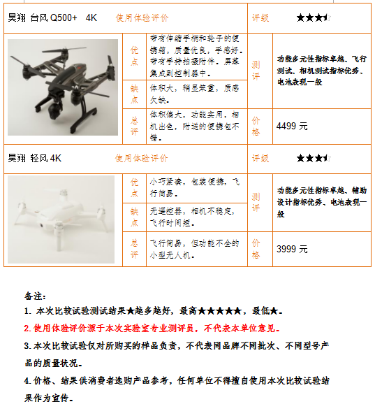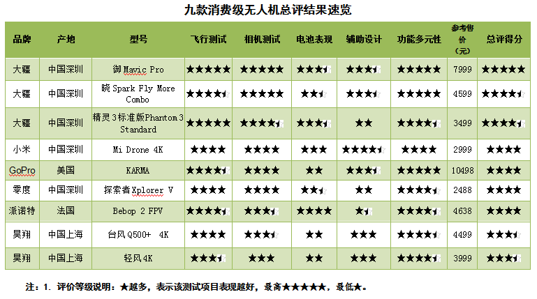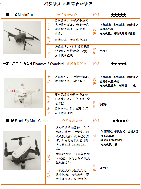 (一)綜合表現(xiàn)最佳。大疆的三款產(chǎn)品綜合評分均高于其他品牌產(chǎn)品,其中“御Mavic Pro”是唯一一個獲得五星等級評價產(chǎn)品。