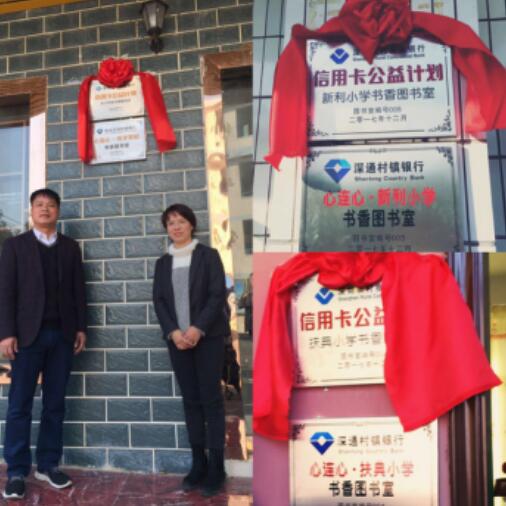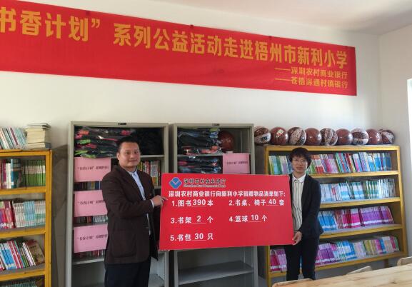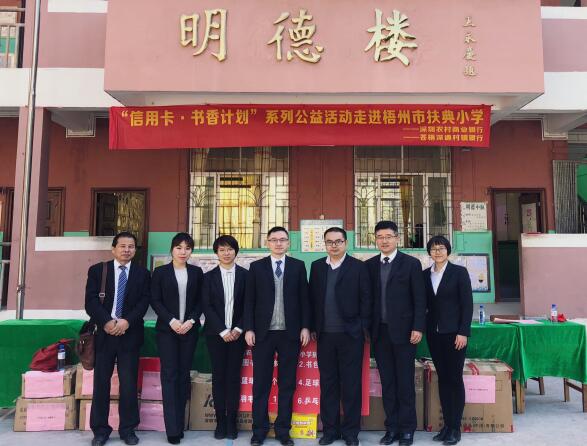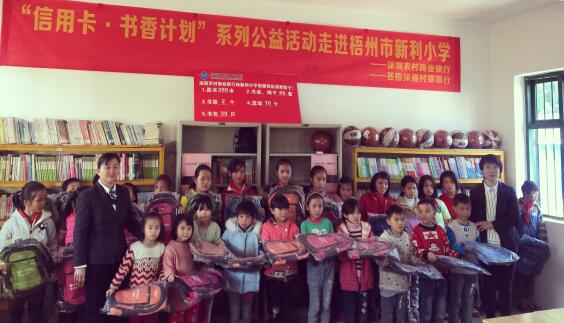 2017年,由深圳農(nóng)商行發(fā)起的“信用卡公益計劃·書香圖書室”捐贈活動,深入走進廣西壯族自治區(qū)的偏遠山區(qū),為當(dāng)?shù)剌^為貧困的扶典小學(xué)、新利小學(xué)、林旺小學(xué)和育才小學(xué)帶來溫暖和鼓勵。本次活動共捐贈各類圖書1899冊、文體用品130套、書包590個、書桌書架椅子42套,有效地幫助這四所小學(xué)建設(shè)充實圖書室,為孩子們創(chuàng)造良好的閱讀環(huán)境,讓更多孩子在閱讀中滋養(yǎng)向上生長的力量。