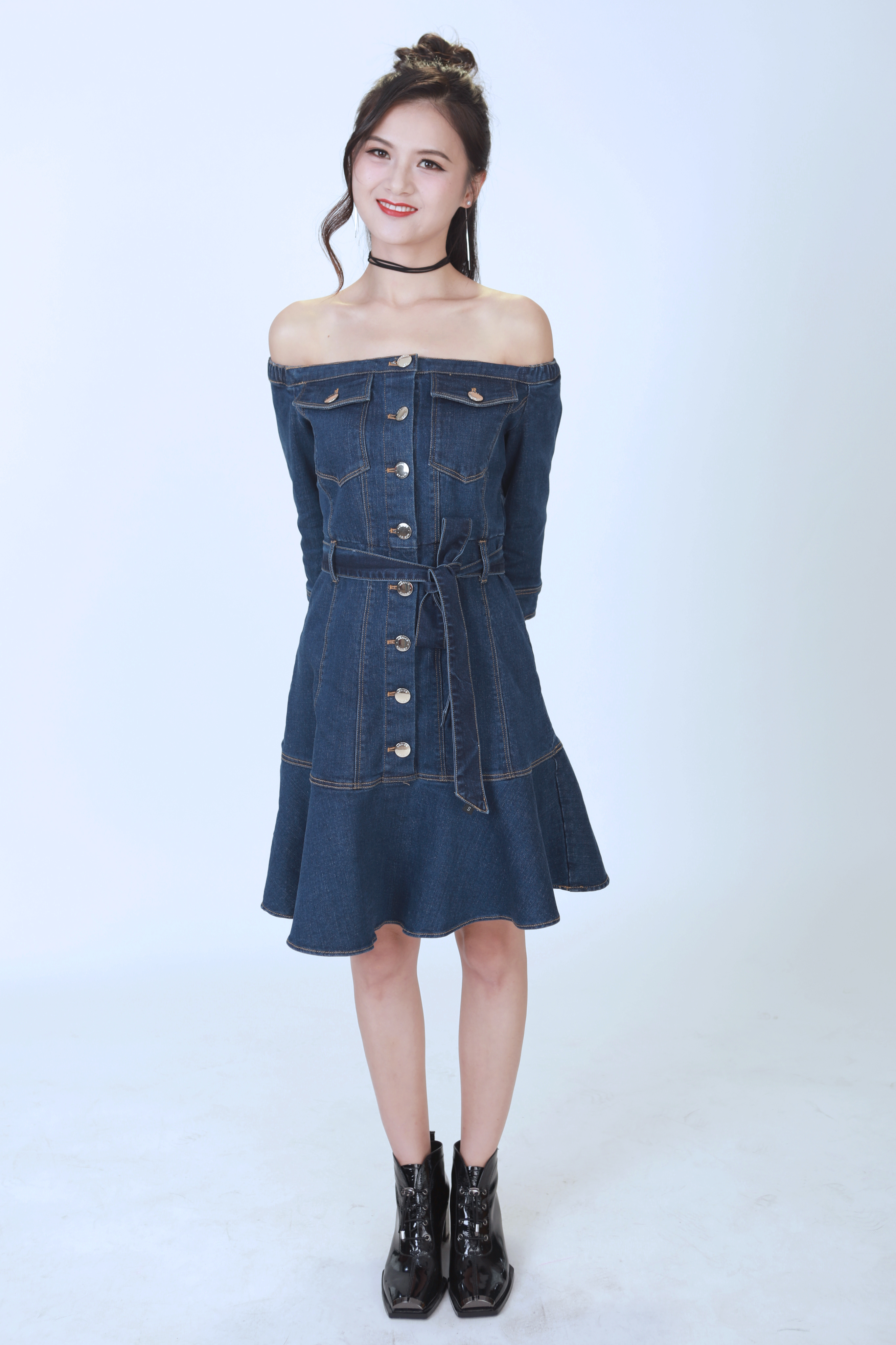 曉敏小仙女第二套造型,一字肩牛仔連體裙 ,露出讓人羨慕哭的鎖骨俏皮又性感。半丸子頭輕松又有女人味。