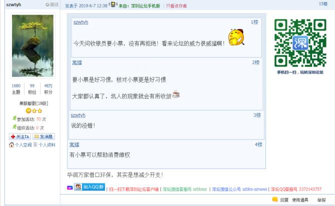 記者從問政平臺得知,5月底以來,還有市民發(fā)帖反映,除華潤萬家外,科技園萬象天地華潤Ole、僑香路沃爾瑪?shù)瘸幸泊嬖诓惶峁┘堎|(zhì)購物小票的情況。目前,市民仍然普遍認(rèn)同超市應(yīng)主動提供紙質(zhì)購物小票,避免顧客被價格欺詐。有市民表示:“遇到最多的是優(yōu)惠打折,實際還是原價買單,這時,手中有小票一目了然,不花冤枉錢?!边€有市民質(zhì)疑,“奸商,動不動就打著環(huán)保這些高大上的理由作借口”。同時,也有市民體驗過微信小票后表示,“沃爾瑪手機(jī)掃碼付款是沒有紙票,購物小票藏在微信公眾號里,退換貨就在那里面進(jìn)行。這就是科技發(fā)達(dá)帶來的豐碩成果,挺好的。”截至記者發(fā)稿時,市民關(guān)于科技園萬象天地華潤Ole、僑香路沃爾瑪?shù)瘸胁惶峁┵徫镄∑钡奶倪€沒有得到相關(guān)部門回應(yīng)。