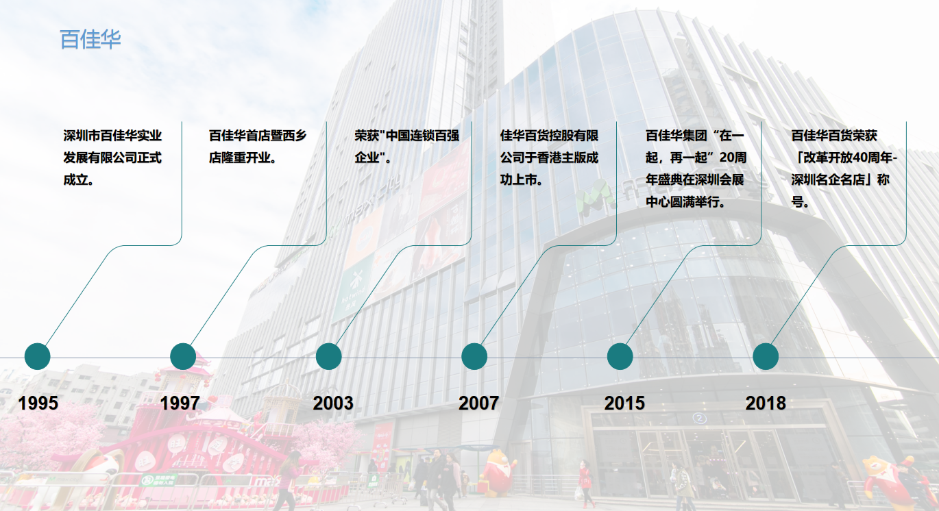 深圳市百佳華百貨有限公司是一家以中國商務(wù)部批準(zhǔn)成立的外商投資企業(yè),注冊(cè)資金22040萬元。目前,公司在深圳、佛山、南寧等地開設(shè)有十多家連鎖購物商場(chǎng),經(jīng)營面積約30萬平方米,年銷售額超20億元。于2007年5月21日在香港聯(lián)交所主板成功上市,成為廣東省為數(shù)不多的實(shí)現(xiàn)整體上市的零售企業(yè)。