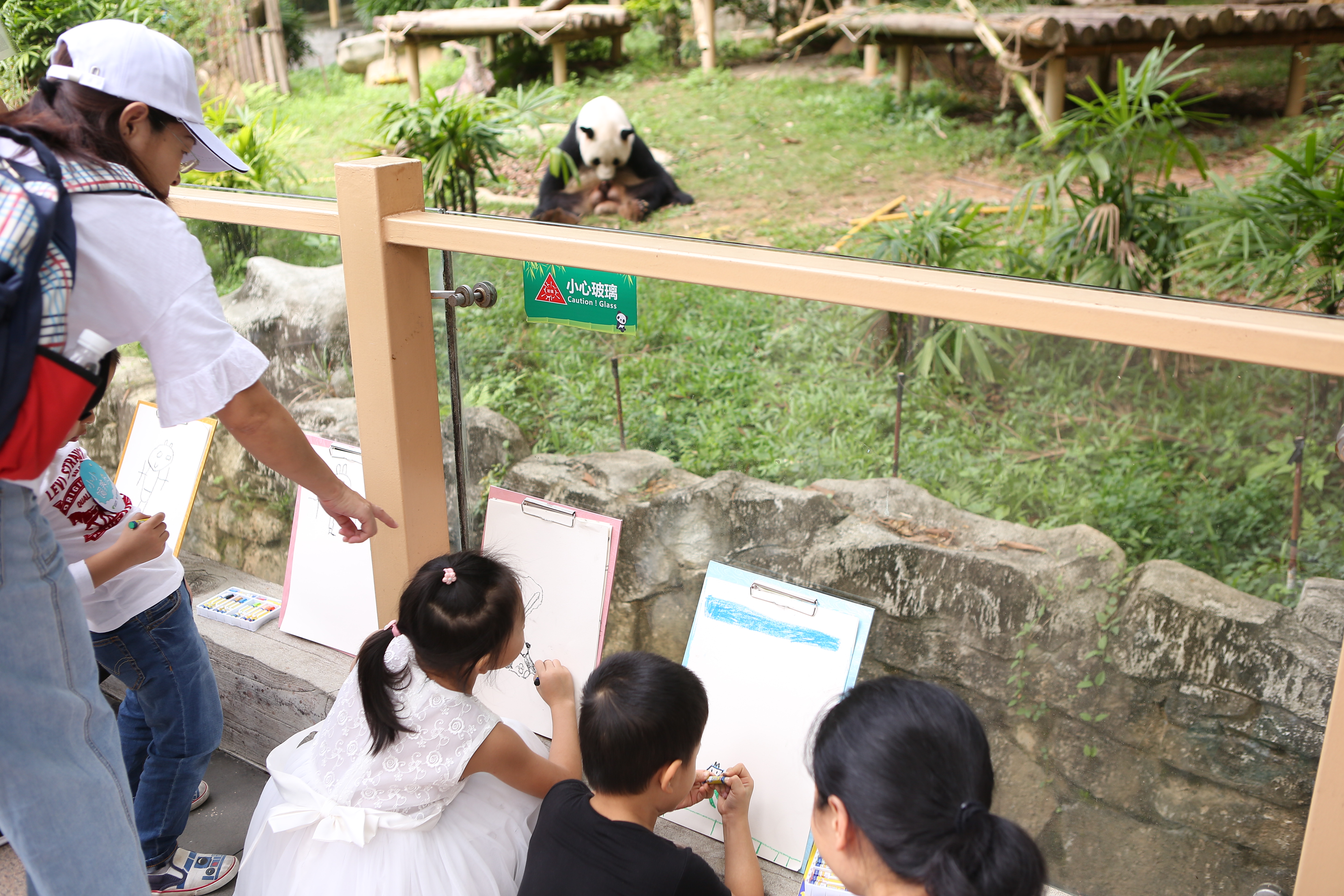 猿猴村的后面,是國(guó)寶大熊貓的家——熊貓莊園。小朋友們來到這里,瞬間被大熊貓圓滾滾的萌態(tài)所吸引。他們或坐或站,拿起畫板,完成了從“小飼養(yǎng)員”到“小畫家”的角色轉(zhuǎn)變。在認(rèn)真觀察大熊貓后,小朋友們揮動(dòng)手中的畫筆,將它們的萌態(tài)一一呈現(xiàn)在畫板上。