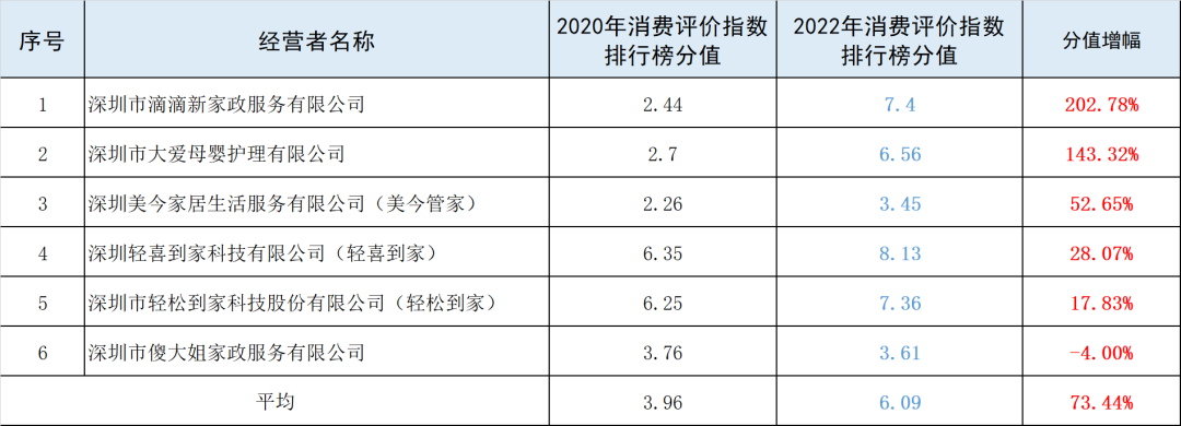 通過與2020年6月公布的深圳市家政行業(yè)消費(fèi)評價指數(shù)排行榜結(jié)果對比,共有6家經(jīng)營者再次上榜,指數(shù)分值平均增長2.13分,平均增幅73.44%。其中5家經(jīng)營者消費(fèi)評價指數(shù)得分均有上升。
