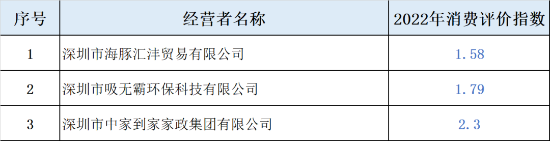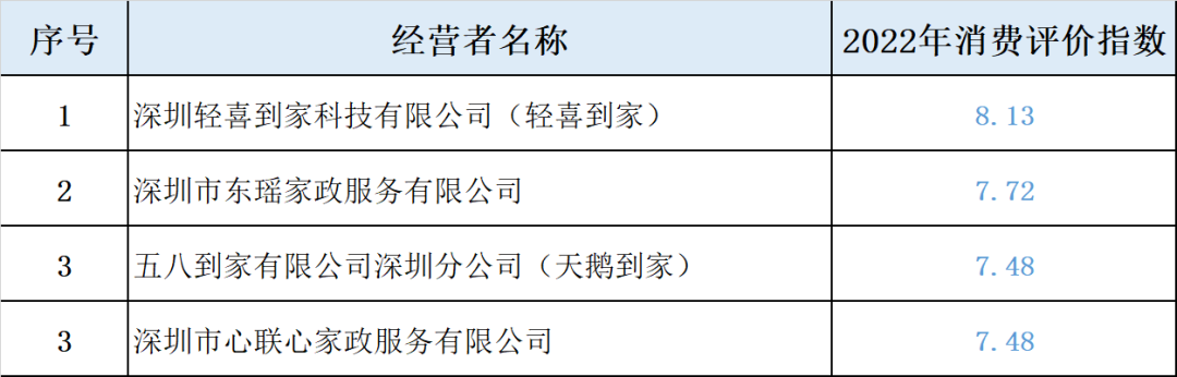 備注:本排名依據(jù)深圳市消委會“315消費(fèi)通”平臺2021年2月1日至2022年1月31日期間,家政行業(yè)年投訴量3宗以上經(jīng)營者消費(fèi)評價指數(shù)從高到低排序。
