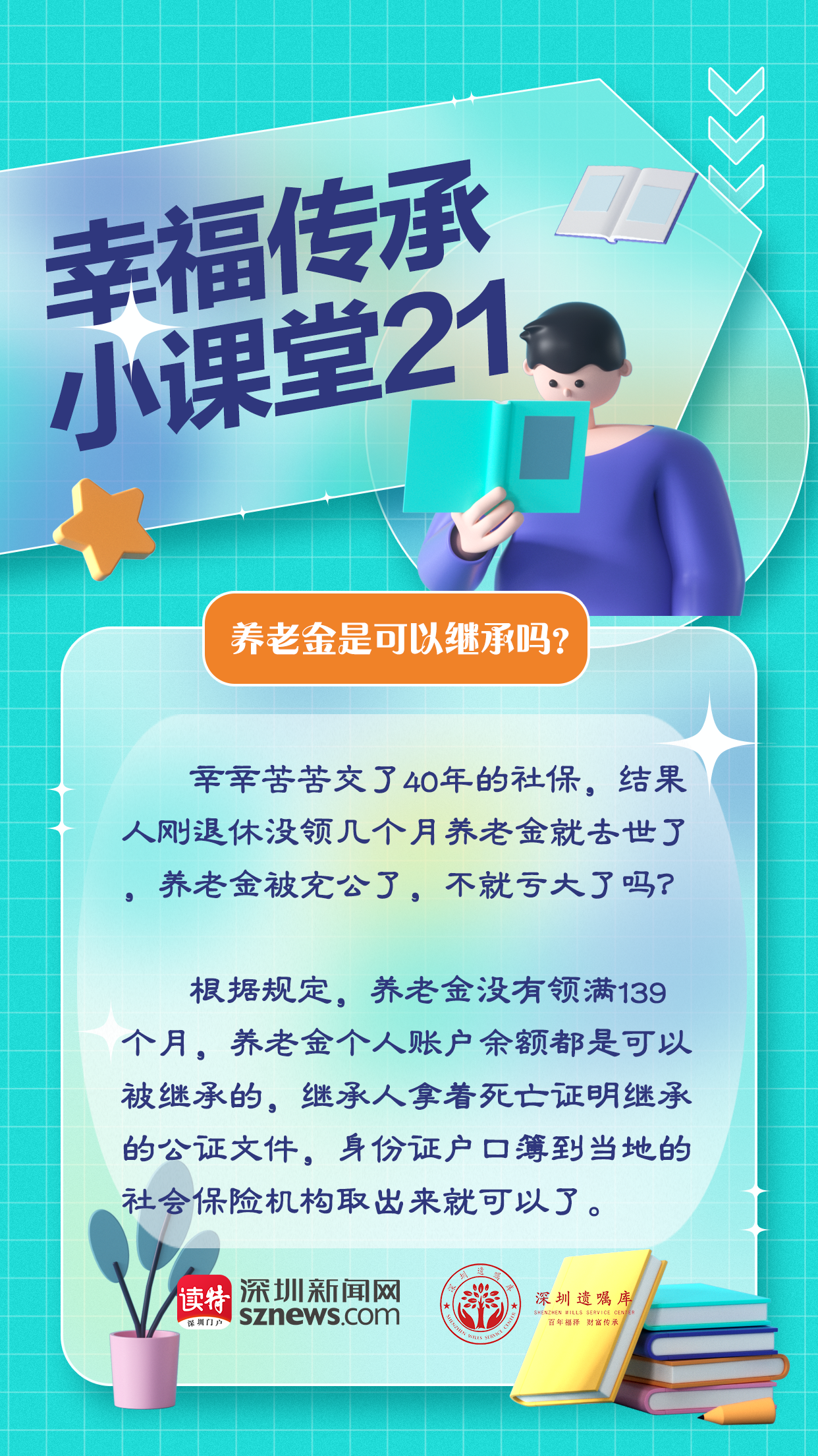 深圳遺囑庫與深圳新聞網(wǎng)聯(lián)合制作的幸福傳承小課堂第21期,我們來聊聊養(yǎng)老金繼承問題。根據(jù)規(guī)定,養(yǎng)老金沒有領(lǐng)滿139個(gè)月,養(yǎng)老金個(gè)人賬戶余額都是可以被繼承的。繼承人拿著死亡證明繼承的公證文件,身份證戶口簿到當(dāng)?shù)氐纳鐣kU(xiǎn)機(jī)構(gòu)取出來就可以了。