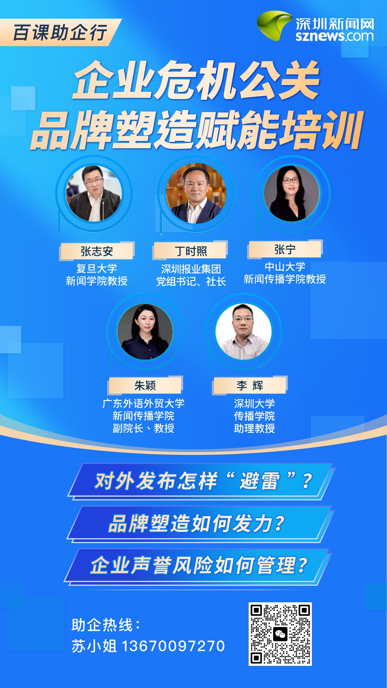 深圳新聞網(wǎng)以長期輿論研究及智庫服務(wù)經(jīng)驗為支撐,不斷充實師資庫、豐富課程體系。目前,智庫團隊包括復(fù)旦大學(xué)新聞學(xué)院教授張志安,深圳報業(yè)集團黨組書記、社長丁時照,中國青年報編委曹林,中山大學(xué)新聞傳播學(xué)院教授張寧,廣東外語外貿(mào)大學(xué)新聞傳播學(xué)院副院長、教授朱穎,深圳大學(xué)傳播學(xué)院助理教授李輝等近百位來自公共關(guān)系、新聞傳播領(lǐng)域?qū)<摇?/p>