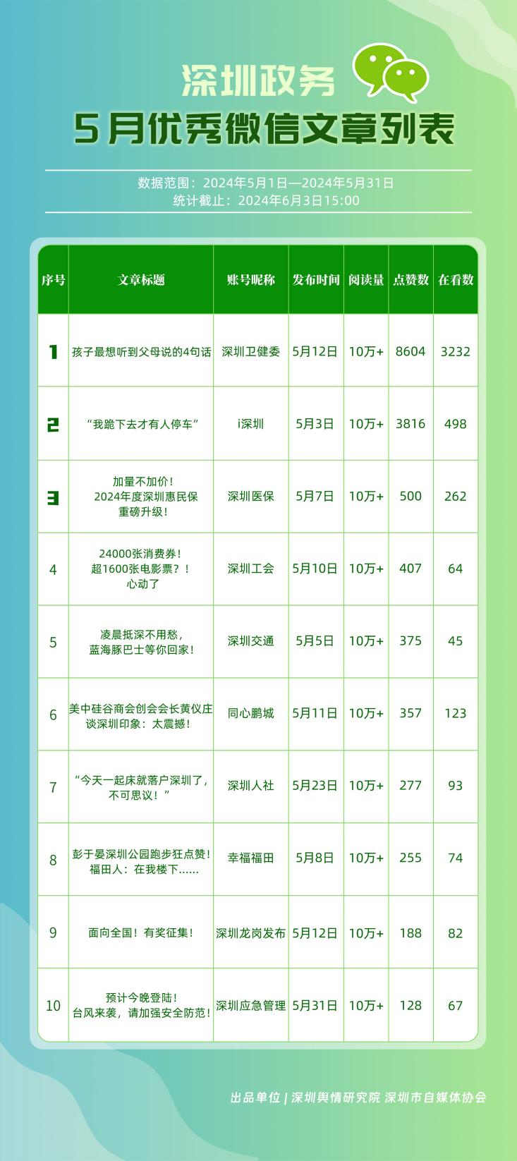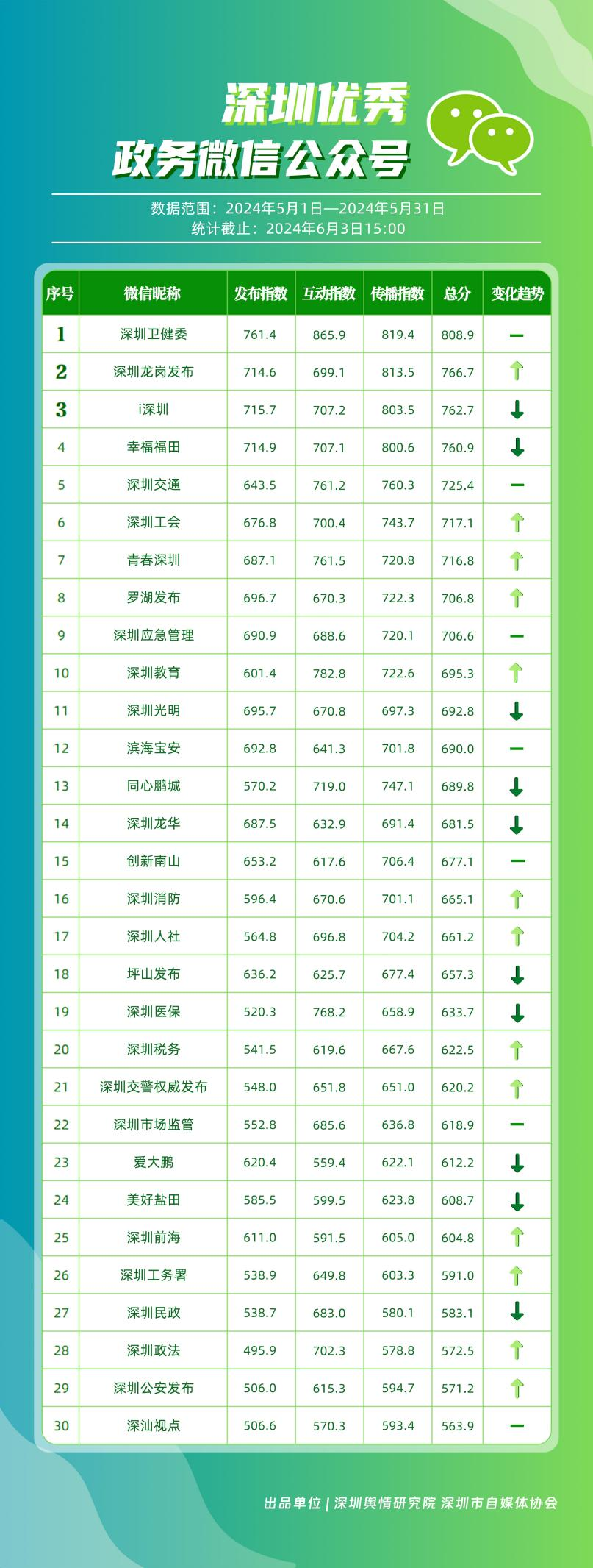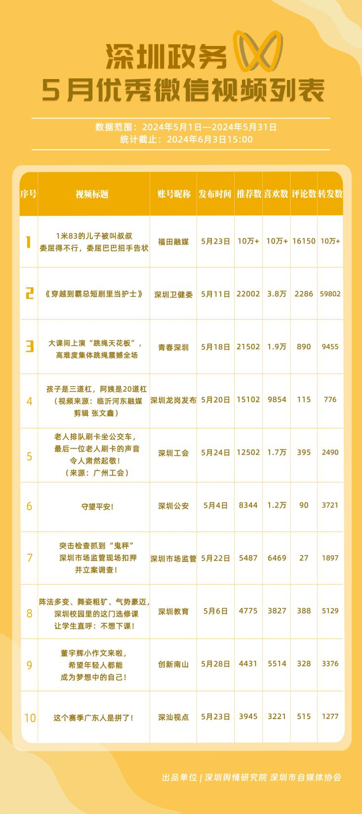 5月,“深圳衛(wèi)健委”“深圳龍崗發(fā)布”“i深圳”“幸福福田”“深圳交通”“深圳工會”“青春深圳”“羅湖發(fā)布”“深圳應(yīng)急管理”“深圳教育”等30個政務(wù)微信公眾號,被評為“深圳優(yōu)秀政務(wù)微信公眾號”。5月,“深圳衛(wèi)健委”憑借精心創(chuàng)作的內(nèi)容、與受眾深入互動,多篇作品深受好評,榮登榜單首位。“深圳龍崗發(fā)布”“i深圳”“幸福福田”“深圳交通”等上榜公眾號也積極捕捉觀眾優(yōu)質(zhì)作品需求,把握主流熱點(diǎn)趨勢,集中發(fā)揮政務(wù)媒體傳播力量,在本期也取得了較為亮眼的成績,進(jìn)一步推動了政務(wù)信息傳播工作提質(zhì)增效。