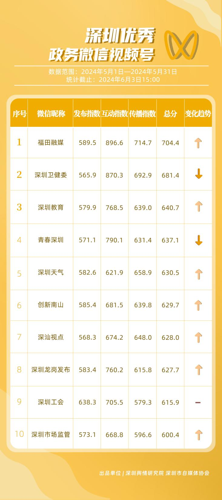 榜單在持續(xù)展示深圳政務(wù)新媒體矩陣建設(shè)成效的同時,梳理總結(jié)了深圳政務(wù)微信公眾號、微信視頻號、微博號、抖音號、頭條號的運(yùn)營方法與經(jīng)驗,是政務(wù)公開、回應(yīng)群眾關(guān)切的重要載體。5月,哪些政務(wù)新媒體在本期深受好評,榮登榜單?《深圳優(yōu)秀政務(wù)新媒體矩陣》(2024年5月期)邀您共同關(guān)注。