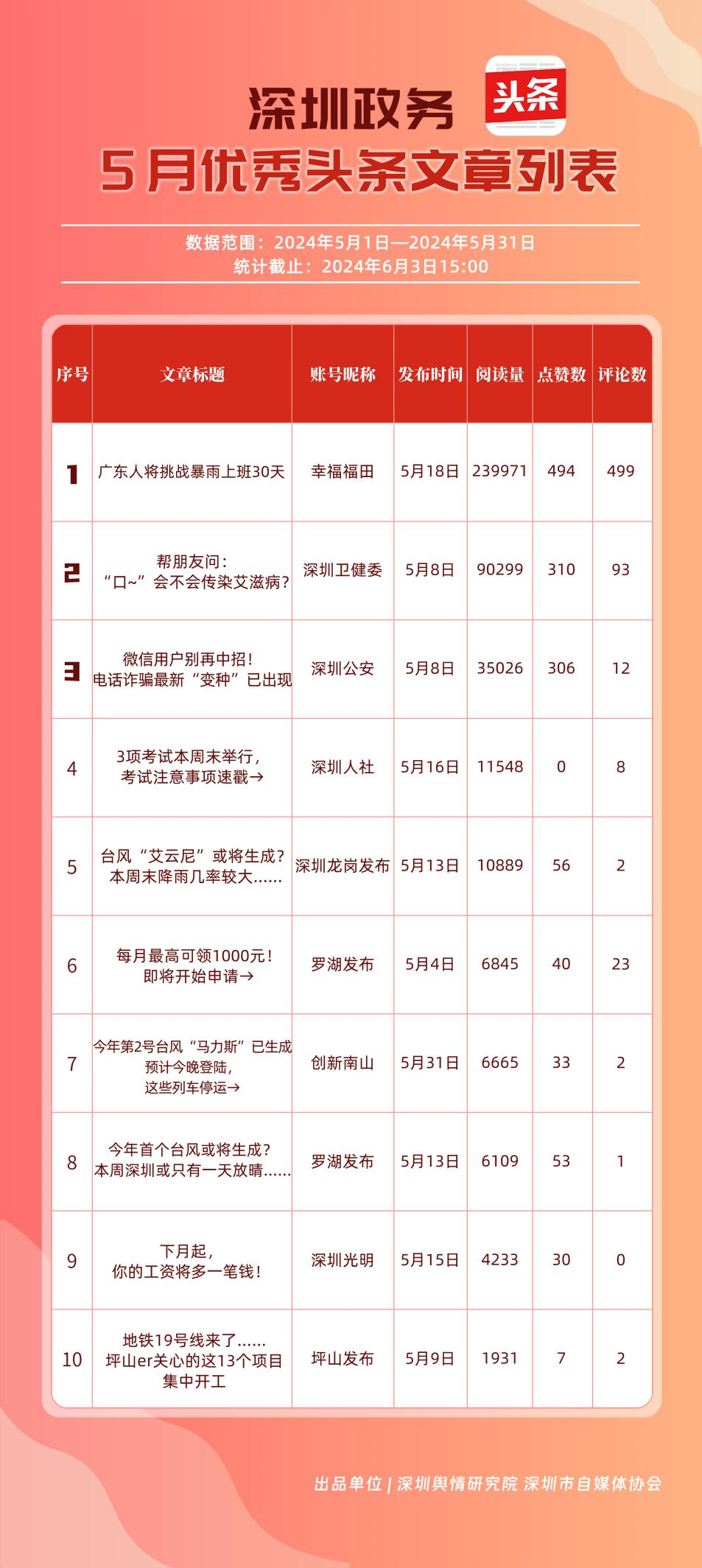 5月,“幸福福田”“深圳龍崗發(fā)布”“深圳衛(wèi)健委”“深圳龍華”“深圳公安”“創(chuàng)新南山”“深圳光明”“羅湖發(fā)布”“深圳人社”“坪山發(fā)布”共10個政務(wù)頭條號能夠及時發(fā)布政務(wù)信息及公共服務(wù)信息,服務(wù)經(jīng)濟(jì)社會發(fā)展,滿足公眾信息需求,位列“優(yōu)秀政務(wù)頭條號”榜單,《廣東人將挑戰(zhàn)暴雨上班30天》《幫朋友問:“口~”會不會傳染艾滋病?》等優(yōu)秀文章資訊深入人心。其他未上榜單位應(yīng)積極運(yùn)用該新媒體平臺助力政務(wù)公開,讓權(quán)威聲音有效傳播到目標(biāo)受眾,更好地服務(wù)人民群眾。