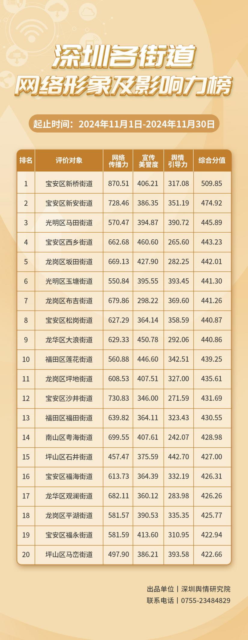 2024年11月,各街道不斷探索治理創(chuàng)新路徑,致力于實現(xiàn)效能的顯著躍升,《深圳各街道網(wǎng)絡(luò)形象及影響力榜》(11月榜單)正式發(fā)布,為您揭曉哪些街道網(wǎng)絡(luò)形象治理實效顯著,成標(biāo)桿,本期榜單數(shù)據(jù)統(tǒng)計范圍為2024年11月1日至11月30日。