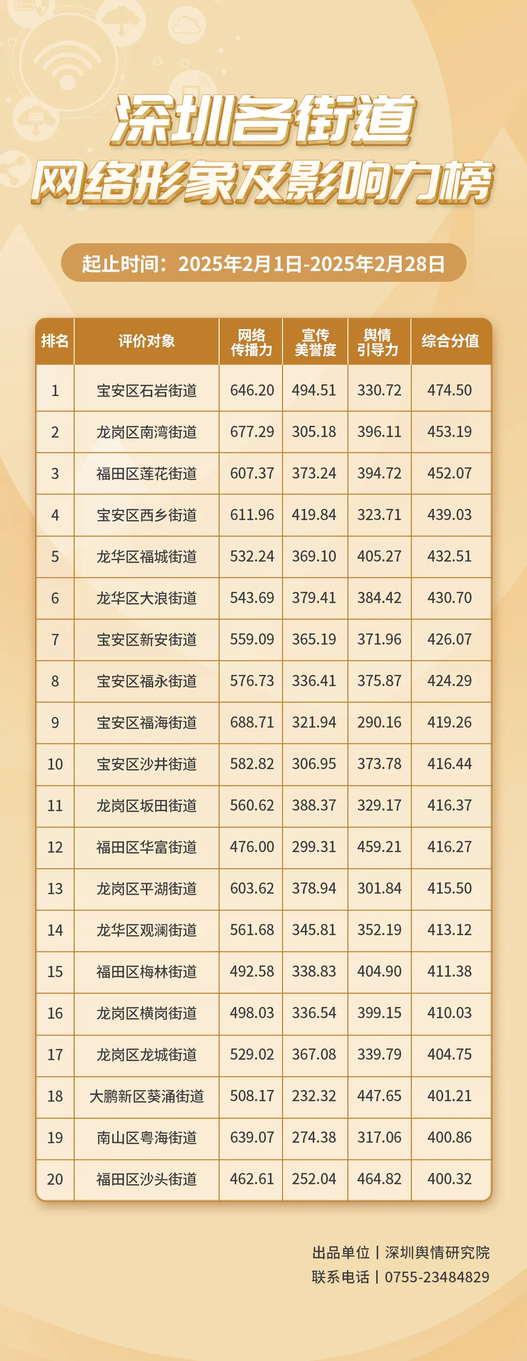 為深入了解深圳市各街道的網(wǎng)絡(luò)形象構(gòu)建狀況和社會(huì)影響,推動(dòng)街道治理“提質(zhì)增效”,增強(qiáng)城市高質(zhì)量發(fā)展動(dòng)能,深圳輿情研究院編制推出《深圳各街道網(wǎng)絡(luò)形象及影響力榜》。榜單具有獨(dú)立客觀的評(píng)價(jià)體系,通過(guò)數(shù)據(jù)采集和分析,評(píng)估各街道的網(wǎng)絡(luò)傳播力、宣傳美譽(yù)度及輿情引導(dǎo)力,并對(duì)全市11個(gè)區(qū)共78個(gè)街道的網(wǎng)絡(luò)形象及影響力進(jìn)行綜合排名。