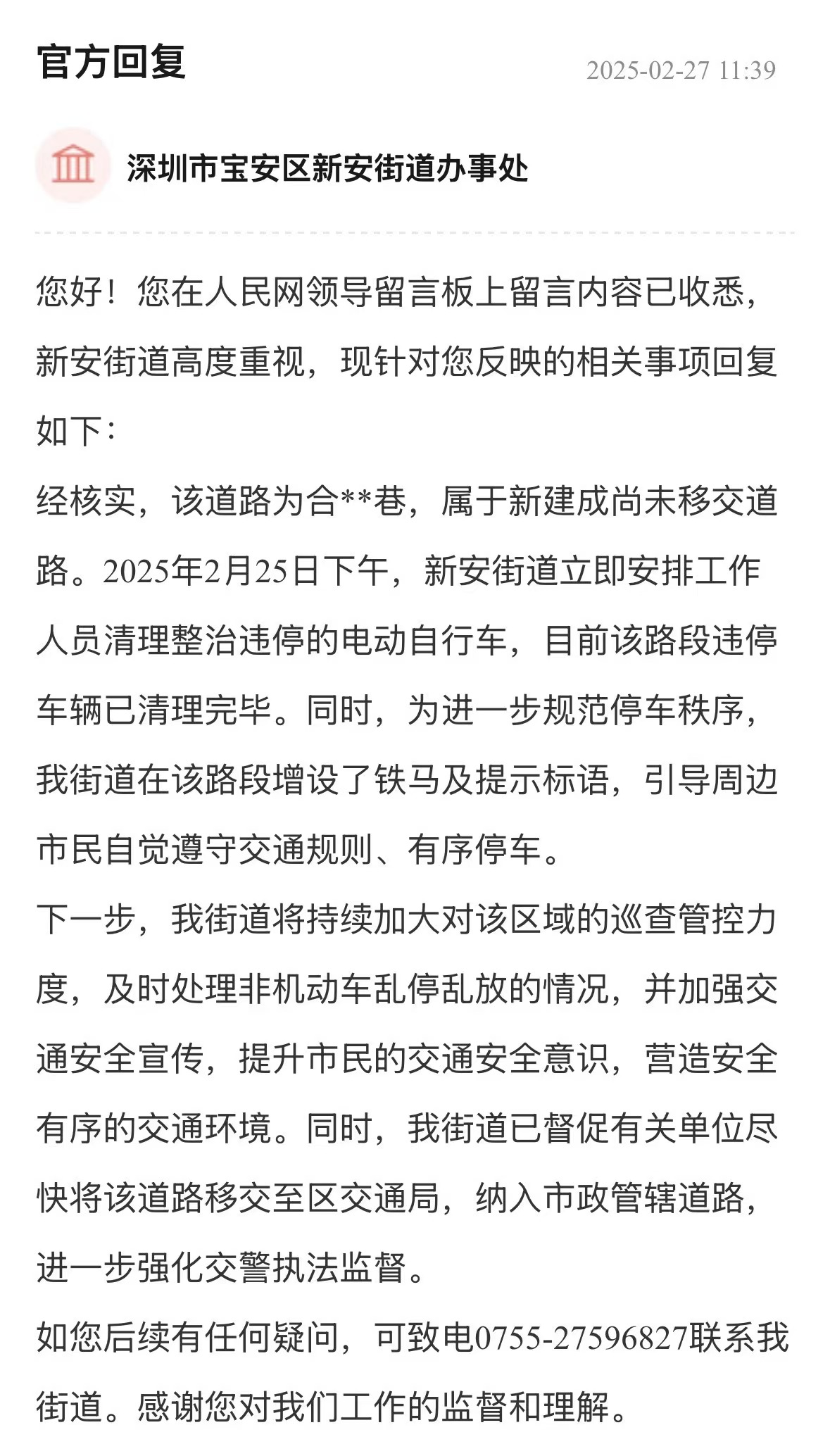 案例點評:非機動車亂停放影響交通和消防安全,嚴重影響市民生活。街道辦行動迅速,第一時間清理違停車輛,增設鐵馬及提示標語,規(guī)范停車秩序,展現(xiàn)了高效的處置能力?;貞?,街道還制定了長效治理計劃,構(gòu)建“短期整治+長效管理”模式,有助于解決區(qū)域交通問題,提升城市管理水平。