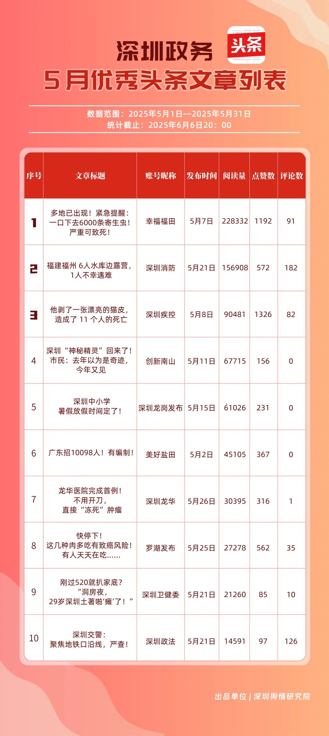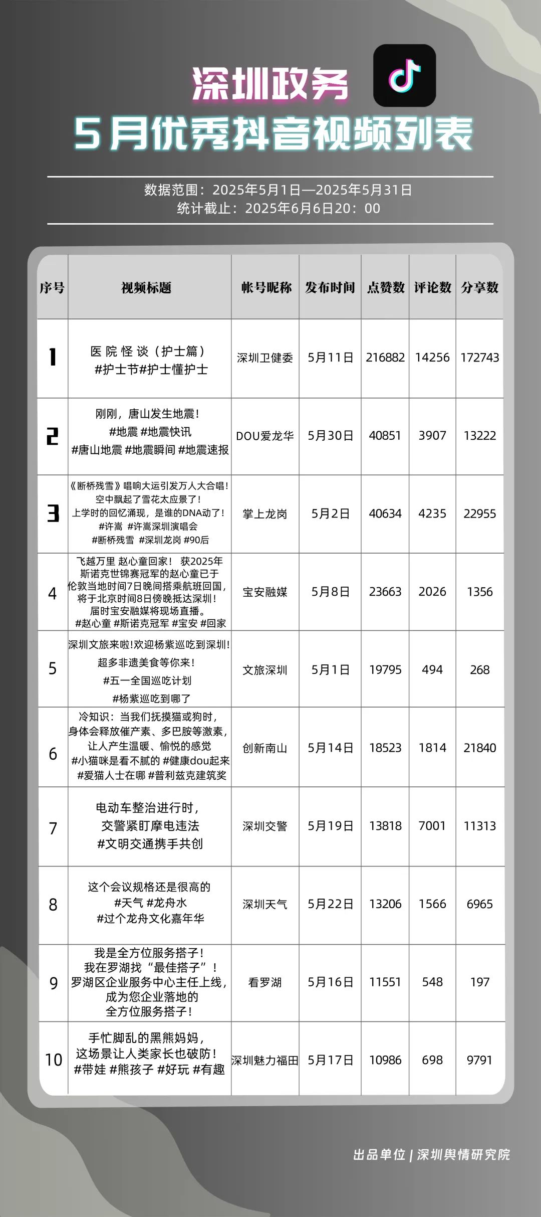 5月,“幸福福田”“深圳消防”“創(chuàng)新南山”“深圳疾控”“羅湖發(fā)布”“深圳龍崗發(fā)布”“坪山發(fā)布”“青春深圳”“深圳龍華”“深圳人社”共10個政務頭條號入選“優(yōu)秀政務頭條號”榜單。在榜單前三名中,“幸福福田”“創(chuàng)新南山”以穩(wěn)定且高質量的內容輸出,持續(xù)領跑,排名較上個月未發(fā)生變動。位居榜單第二的“深圳消防”同樣表現亮眼,排名較上個月提升2個名次,充分展現了其在消防安全宣傳領域的持續(xù)深耕和創(chuàng)新突破。上榜政務頭條號各展所長,以優(yōu)質內容為核心,充分發(fā)揮平臺傳播優(yōu)勢,為政務信息的高效觸達與廣泛傳播樹立了標桿。