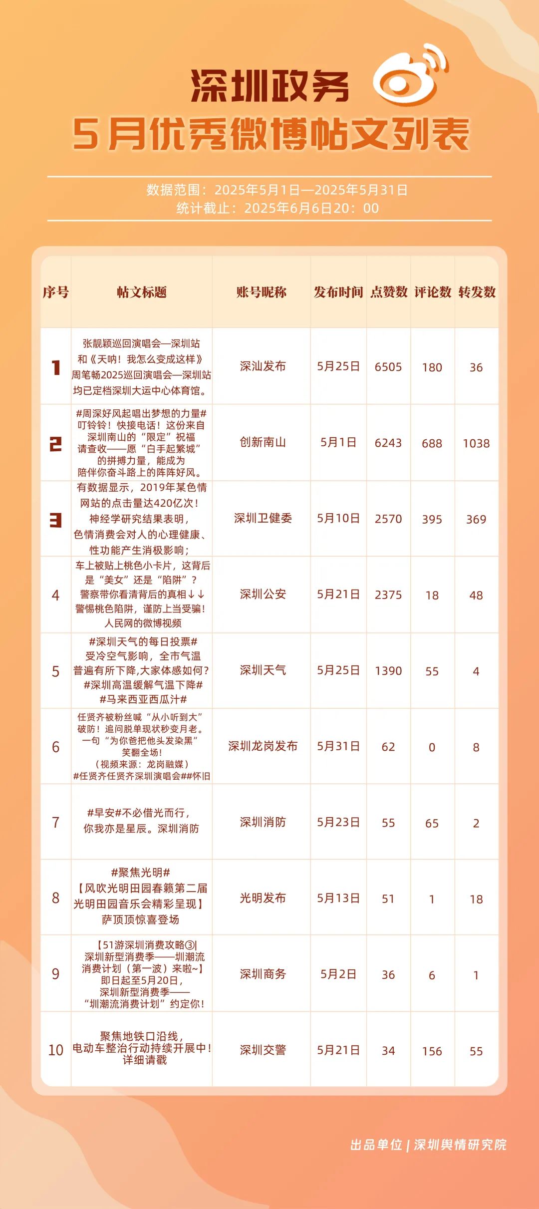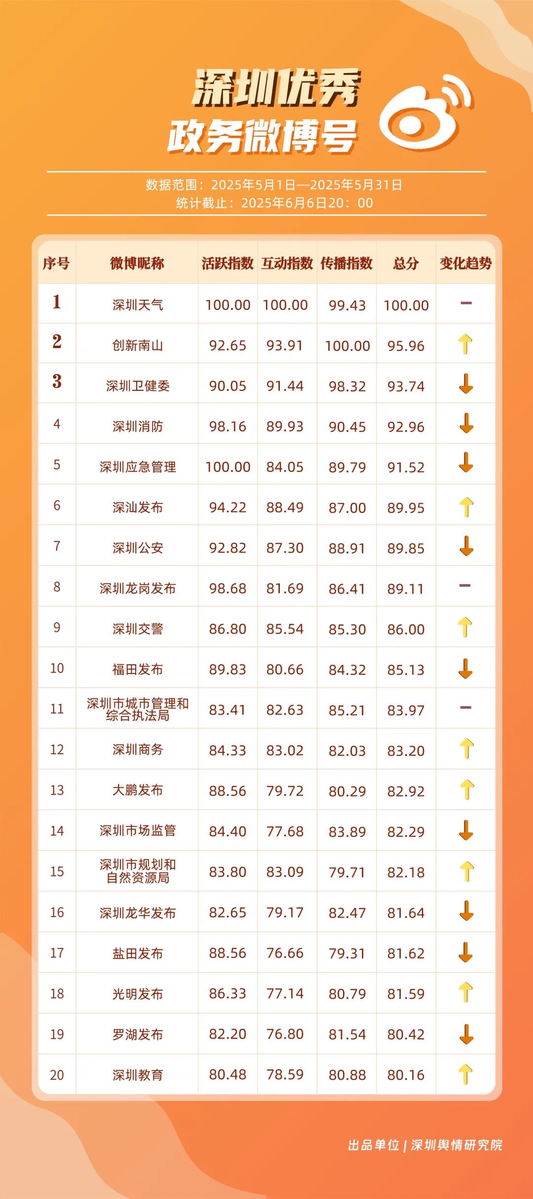 5月,“深圳天氣”“創(chuàng)新南山”“深圳衛(wèi)健委”“深圳消防”“深圳應急管理”“深汕發(fā)布”“深圳公安”“深圳龍崗發(fā)布”“深圳交警”“福田發(fā)布”等20個賬號入選“優(yōu)秀政務微博號”。其中,“深圳天氣”憑借活躍指數和互動指數雙項滿分的亮眼成績,穩(wěn)居榜單首位?!皠?chuàng)新南山”以95.96分緊隨其后,在互動、傳播指數得分大幅提升,排名實現顯著躍升。“深圳衛(wèi)健委”“深圳消防”“深圳應急管理”也表現卓越,總分均超過90分,它們憑借權威信息發(fā)布、專業(yè)知識科普,展現了各單位在民生服務、公共安全領域的重要作用。以上優(yōu)秀政務微博號深度契合平臺的傳播特征,善于借助熱門話題擴大影響力,以鮮明的賬號特色展現區(qū)域風采。