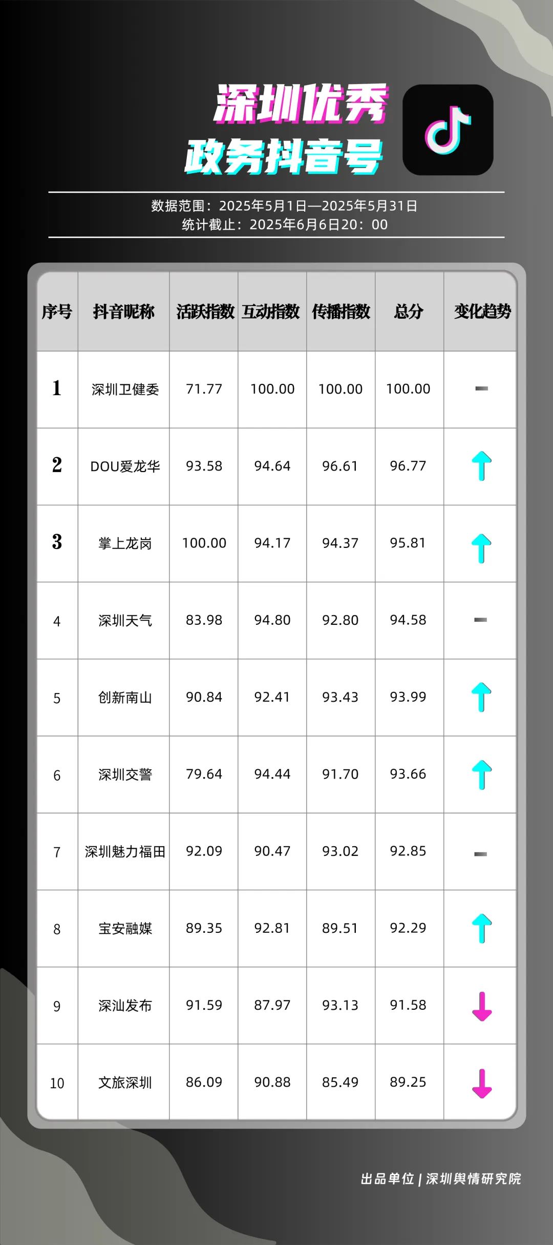 5月,深圳政務新媒體矩陣各展所長,為市民帶來豐富實用的信息服務。市衛(wèi)生健康委、龍崗區(qū)、福田區(qū)、南山區(qū)、市氣象局、深汕特別合作區(qū)、龍華區(qū)、市公安局交通警察局、寶安區(qū)、市應急管理局入選“深圳優(yōu)秀政務新媒體矩陣”榜單。從排名變化來看,與4月相比,龍崗區(qū)、南山區(qū)、龍華區(qū)、市公安局交通警察局、寶安區(qū)的排名均有顯著提升。其中,龍崗區(qū)通過優(yōu)化微博和微信視頻號的內容運營,有效提升了互動性和傳播效能;南山區(qū)則在微博和抖音平臺發(fā)力,取得了較好的運營成效。這些成績充分展現了各政務新媒體矩陣在運營方面的創(chuàng)新活力,為提升政府服務效能作出了積極貢獻。